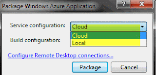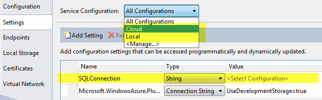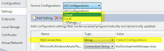 ============== Recently I have been working heavily on CRM2011 + Azure platform, just want to share some of the quick tips for those plan to move their application into Cloud! You will notice some extra file in your VS2010 solution when you added the Azure web role project, 2 configuration files included which differentiate by the "Cloud" & "Local". It give us the flexibility to deploy our solution base on different environment. For example my case I'm using different DB. In order to configure the values, right click properties brings us into the setting page that allows developer to add the key into different configuration files. Always remember to select the service configuration that you want to use base on your deployment. To retrieve the value dynamically on run time after deployment, refer below: Microsoft.WindowsAzure.ServiceRuntime.RoleEnvironment.GetConfigurationSettingValue("SQLConnection") Источник: http://eastoceantechnical.blogspot.c...tion-file.html