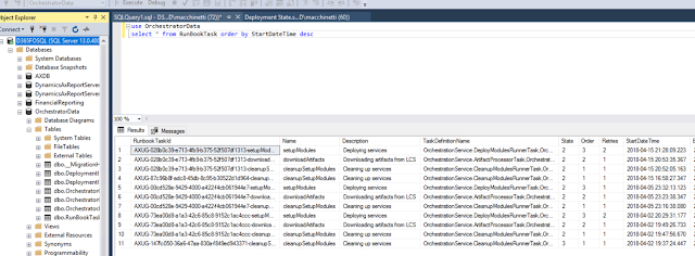 ============== Greetings! On a Dynamics 365 for Finance & Operations LBD Deployment, can occur that the Deployment fails on a certain step like the SSRS App Deployment, Synch, etc. In order to check the Deployment status and the running task, you can run the below query against the «OrchestratorData» Database. use OrchestratorData select * from RunBookTask order by StartDateTime desc In such case, just fixed the issue we can restart the Deployment in two ways: